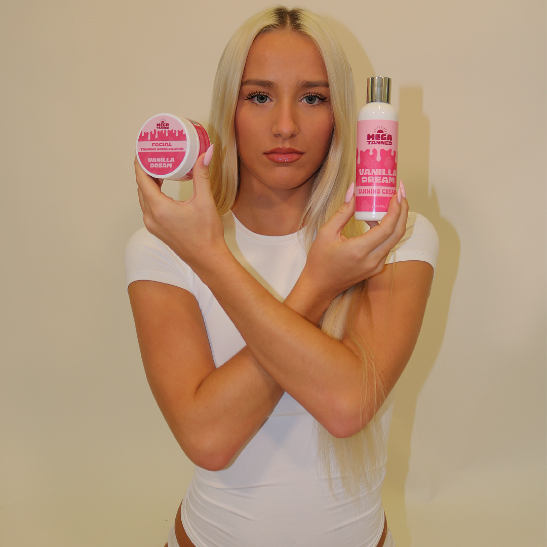 The Mega Tanned Vanilla Dream Tanning Cream is a rich, hydrating tanning accelerator designed to help speed up your natural tanning process while deeply nourishing the skin. Infused with moisturising, skin-loving ingredients, this cream helps support melanin production, allowing you to develop a deeper, darker, longer-lasting tan in less time.